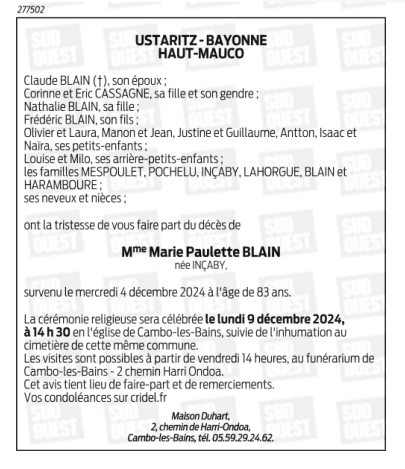 Décédée à Bardos (64520, France) le mardi 3 décembre 2024 à l'âge de 83 ans