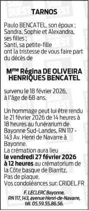 Décédée à Bayonne (64100, France) le mercredi 18 février 2026 à l'âge de 68 ans