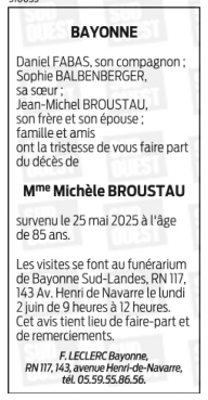 Décédée à Bayonne (64100, France) le dimanche 25 mai 2025 à l'âge de 85 ans